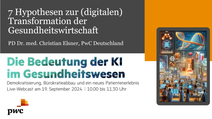 In seinem Vortrag auf unserer Veranstaltung „KI im Gesundheitswesen“ stellte PD Dr. med. Christian Elsner, PwC Deutschland, sieben zentrale Hypothesen vor, die zeigen, wie sich die Gesundheitswirtschaft künftig weiterentwickeln könnte. Dieser Beitrag fasst die Kernideen leicht verständlich zusammen, beleuchtet verschiedene Perspektiven und gibt Einblicke in die anschließende Diskussion.